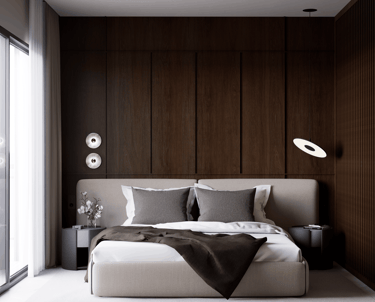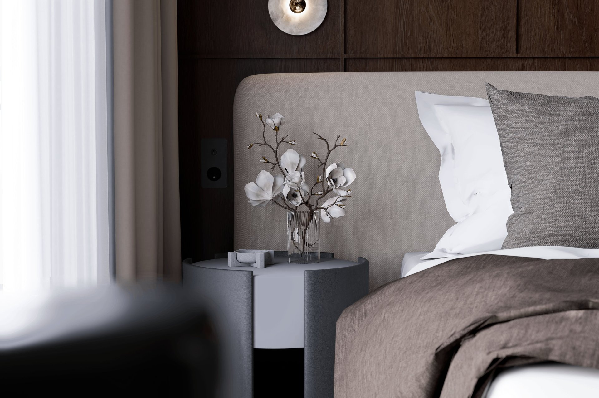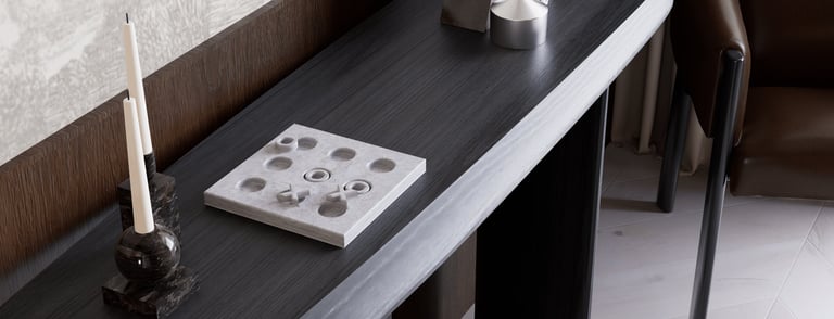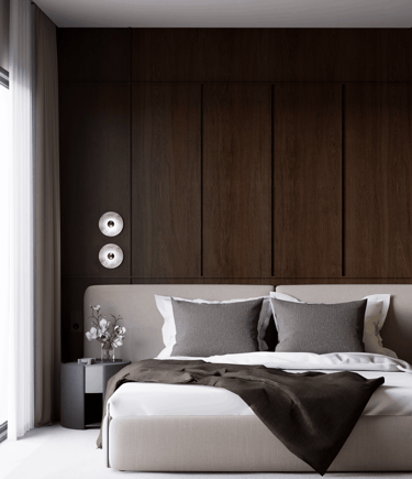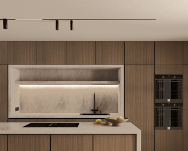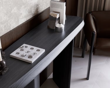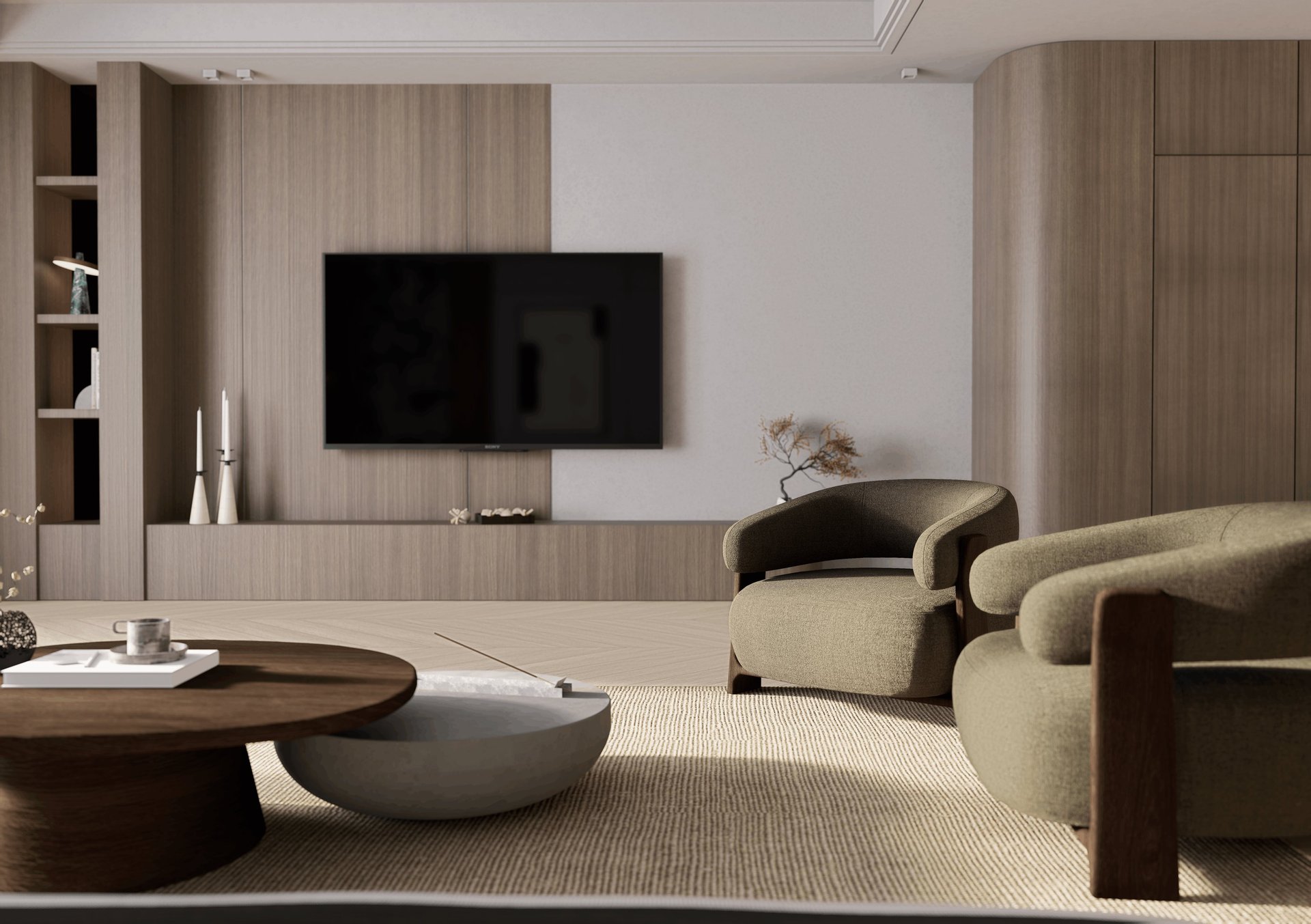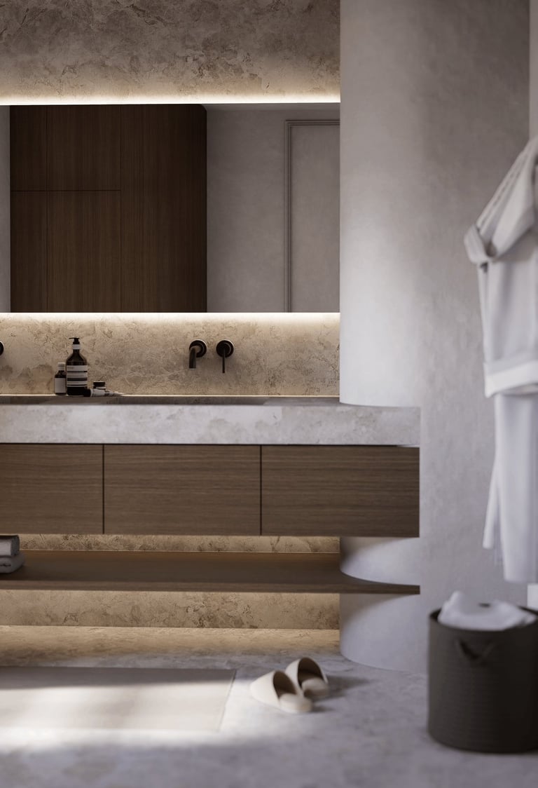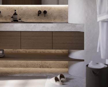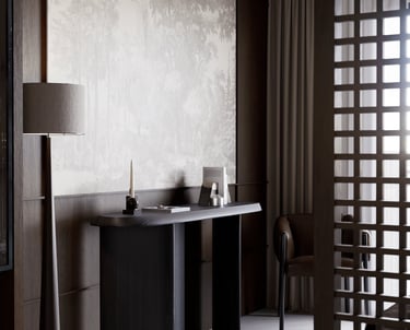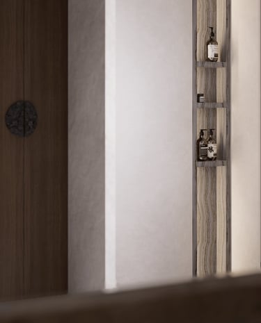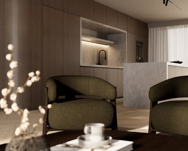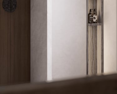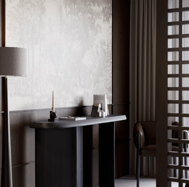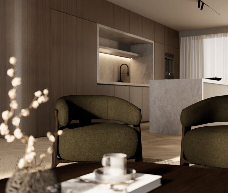 Enfin, le dialogue subtil entre lignes droites et courbes vient adoucir les perspectives, créant une spatialité fluide et organique. C'est cet équilibre entre rigueur et douceur qui confère à l’appartement une cohérence forte, avec une esthétique à la fois actuelle et intemporelle.