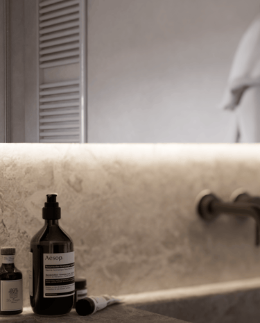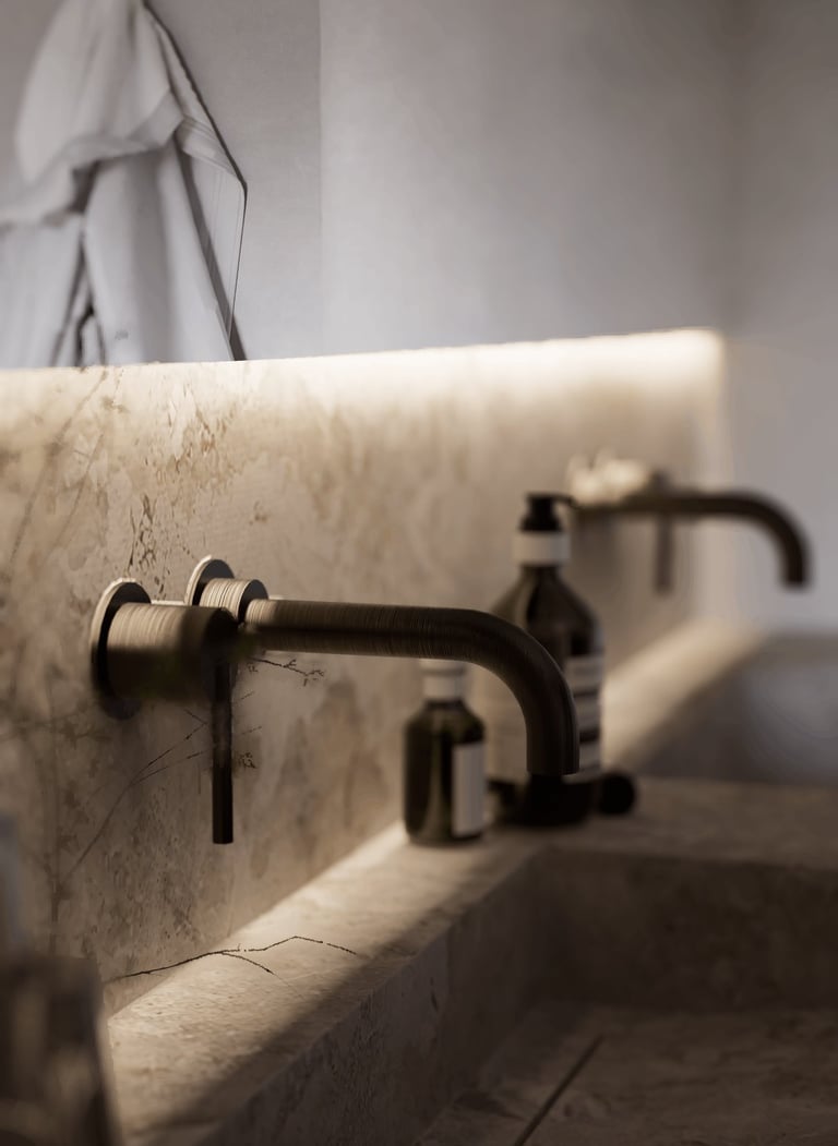 L’aménagement final révèle une atmosphère sobre, chaleureuse et éclectique où différentes influences architecturales s’harmonisent dans une écriture contemporaine. Le bois constitue l'un des fils conducteurs de ce projet : parquet en point de Hongrie au sol et revêtements muraux sur mesure enveloppent les volumes d’un charme intemporel. Le parti pris des matériaux bruts tel que la pierre, les enduits et le bois valorise leur authenticité mais aussi leur caractère naturel.